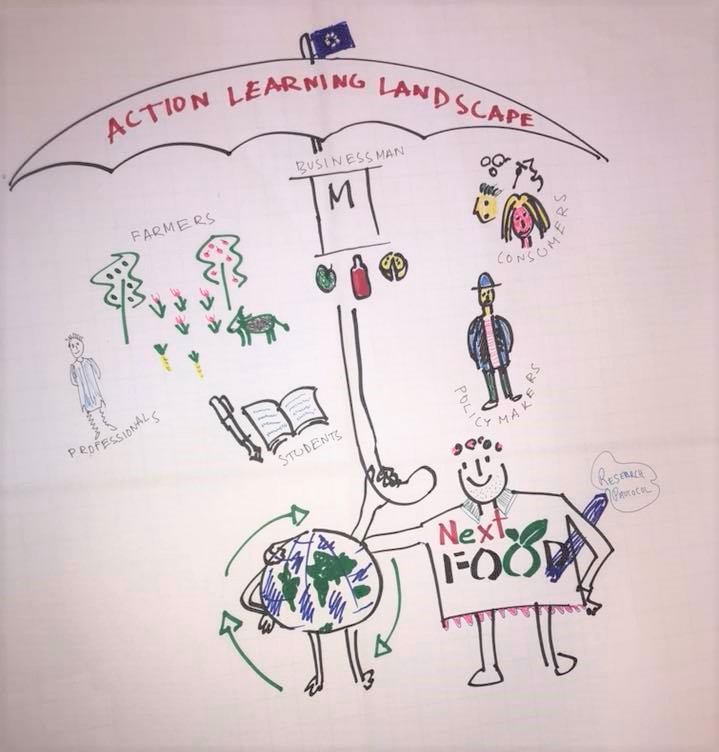 Representatives of the 12 NEXTFOOD cases met in Pollenzo, Italy, for a joint development of the project action research method. The vision of NEXTFOOD, stakeholders in the agrifood and forestry chain working together for developing a sustainable education, was captured in this creative sketch.